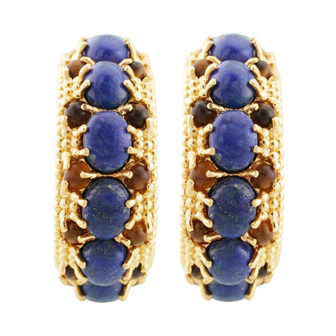 Gold hoop earrings with lapis lazuli and tiger's eye.