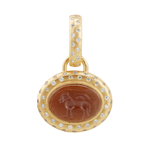 A wine-red resin stone based on Ancient Roman carnelian relics carved with an animal motif, sits east-west in a donut-shaped bezel setting. The gold border, and the pendant’s bail are profusely studded with tiny cubic zirconia gems. Ornate, theatrical, unapologetic. Suits late hours, lush velvet, and entrances made to be remembered.