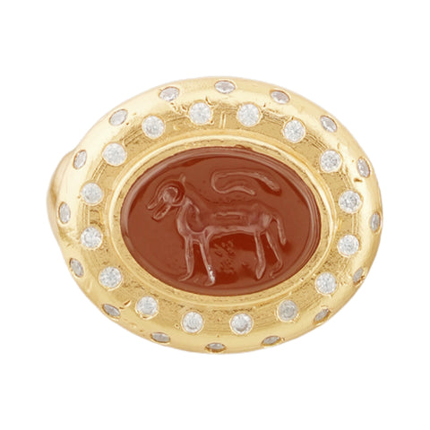 Set within a cubic zirconia-studded golden donut bezel, it captures both history and subtle drama. Wears well as a statement of quiet power and storied elegance.
