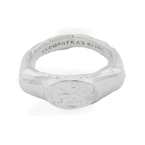 The Hinnulus Signet Ring is a simple silver signet ring with textural etchings on its face. This ring comes in larger sizes for a wider array of hands, including, for example, as a men’s ring.