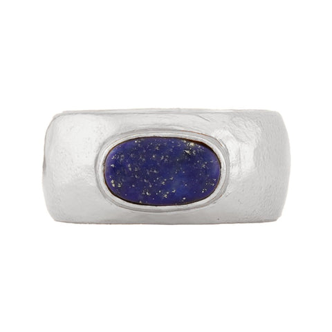 A wide cigar band in gold holds an oval cabochon lapis lazuli, bezel-set to securely show off the beauty and weight of this natural stone. Perfect as a men’s ring, women’s ring, or ring for any gender. Made for signing letters by candlelight or slipping on before leaving the city at first light.