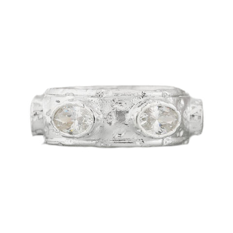 Faceted oval cubic zirconia gems, bezel set and spaced evenly around the flat silver band with raised edge, echo the arrangement of the Medici balls, lending it a heraldic design rhythm. Fits just as effortlessly in the boardroom as it does under the glow of an opera chandelier.